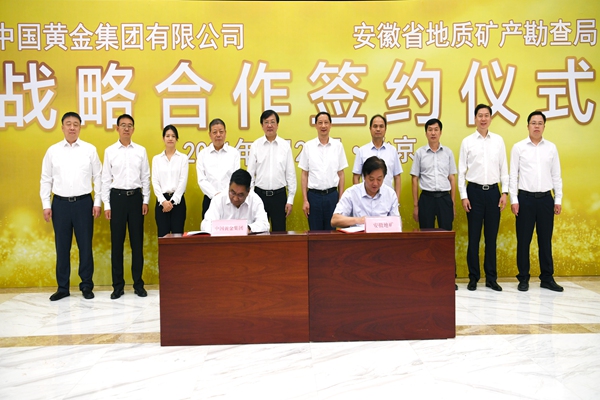 6月20日,安徽省地矿局与中国黄金集团有限公司在北京举行战略合作签约仪式。局党委书记、局长朱学文,中国黄金集团公司党委书记、董事长卢进出席仪式并讲话,中国黄金集团公司党委副书记、董事、总经理刘冰主持签约仪式。局党委委员、副局长侯其标与中国黄金集团公司副总经理王佐满代表双方签署战略合作协议。